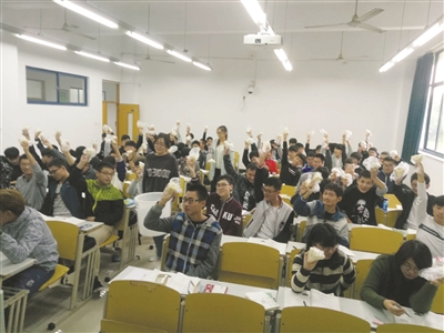 电容、电感是一组难懂的概念,而嵇教授却花心思用一个小实验让学生很快地理解了它们。他利用常见的器材组装了一个简易电路,为了验证电路的可用性,还特意安装了一个小灯泡,电路运行的时候灯泡能逐渐变亮,同时将连接在电路上的一个特殊装置放在装有泥鳅的水桶里,泥鳅一开始在水里很平静。突然切断电路,原本平静的泥鳅立即就翻腾起来了,这意味着有一股强大的力量随着电路的切断也瞬间释放了。嵇教授借着这个实验解释其中的原理及有关概念,并提醒同学们在今后检修大型器械时,一定要注意在切断电源时电感容易产生危险。“如此一来,我们很容易就记住了抽象的概念,并且也强化了注意用电安全的意识。”机电172班的袁一雯同学说。