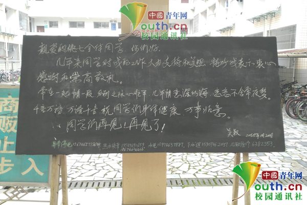 记者了解到,黑板上除了吴作社给同学们的留言,在其最下端还有解决停电、热水、下水道维修的联系电话。