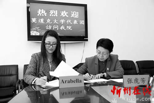 本报讯 3月20日,澳大利亚莫道克大学国际学生办公室中国区域负责人ArabellaZhao与其助理韩忻彦女士到忻州师范学院进行合作项目洽谈,两校就具体合作意向进行了商谈并签署协议。(本报通讯员)