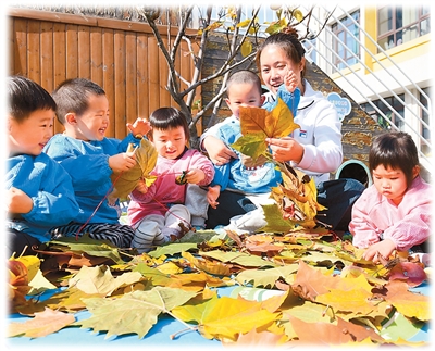 2025年11月6日,在山东省济宁市任兴托幼一体实验园,老师陪伴托育班的小朋友做游戏。新华社记者 郭绪雷摄