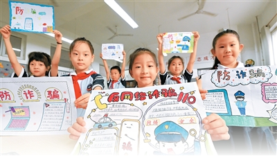 河北省邯郸市复兴区阳春小学的学生们展示网络安全主题手抄报。郝群英摄(人民视觉)