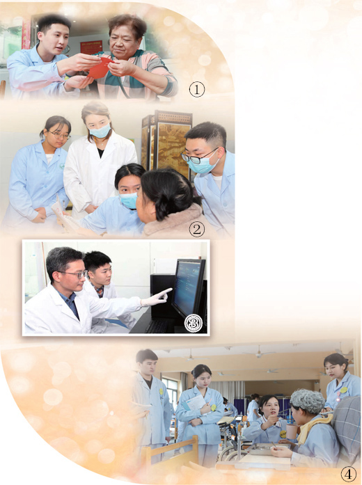 图④:长沙民政职业技术学院智慧健康养老教师团队成员、主管护师谢海艳(右三)在实训室给学生讲授老年人生活照护技术。人民日报 记者 王云娜摄