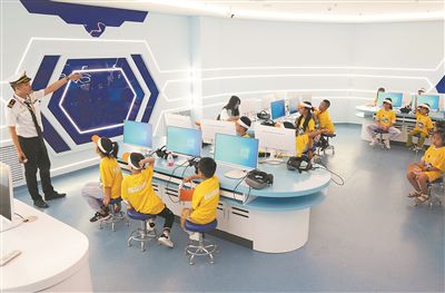 7月8日,在极地海洋研学教育基地“淘学企鹅馆”的VR教室,工作人员在给孩子们进行科普授课。新华社记者 王建威摄
