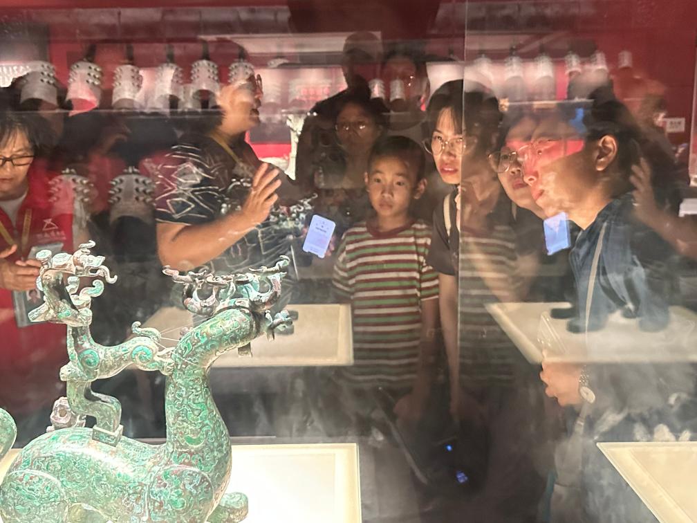 7月21日,游客在河南博物院观看春秋时期神兽造型的乐器支架。(新华社记者翟翔 摄)