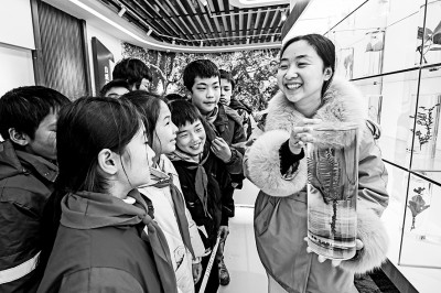 江西省抚州市资溪县马头山林场野生中药资源科普馆,指导老师为镇中心小学学生讲解珍稀药材香榧的功效与作用。 吴志贵摄/光明图片