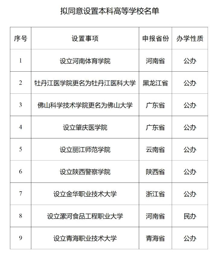 根据《中华人民共和国高等教育法》《普通高等学校设置暂行条例》《普通本科学校设置暂行规定》《本科层次职业学校设置标准(试行)》等有关规定以及第八届全国高等学校设置评议委员会考察评议结果,经教育部党组会议审议,拟同意设置河南体育学院等9所学校,现予公示。其中,2所高校更名,7所高校为新设。