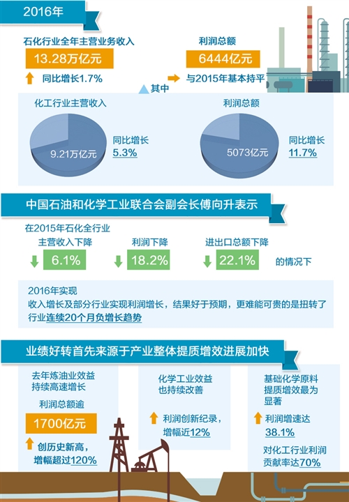 业绩好转首先来源于产业整体提质增效。具体来说,2016年炼油业产品结构调整继续加快,国V汽柴油升级改造全面完成。由于成本下降及优质优价的原因,去年炼油业效益持续高速增长,利润总额逾1700亿元,创历史新高,增幅超过120%。同时,化学工业效益也持续改善,利润创新纪录,增幅近12%。“特别是基础化学原料提质增效最为显著,利润增速达38.1%,对化工行业利润贡献率达70%;合成材料利润也呈现高速增长势头,增幅达41.8%,位居化工各行业之首,贡献率超过38%。”中国石油和化学工业联合会信息与市场部副主任祝昉说。
