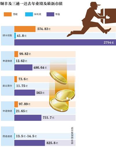 2016年度,顺丰营业利润36.93亿元,同期增长44.20%;归属净利润为41.80亿元,同期增长112.51%。报告期扣除非经常性损益后归属于上市公司股东的净利润约为26.43亿元。中通净利润21.65亿元,同比增长76.8%;申通净利润为12.62亿元,同比增长64.97%;韵达净利润11.75亿元,同比增长120.63%;依据圆通1月底发布的2016年度业绩修正预告,报告期内圆通预计归属净利润为13.5亿-14.5亿元,同比增长88%至102%。
