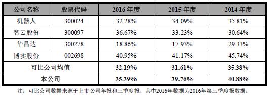2014年至2016年,同行业上市公司综合毛利率均值分别为35.38%、31.61%、32.19%。克来机电综合毛利率高于可比公司均值。