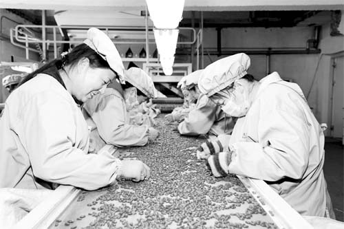 岢岚县信用联社扶持该县泰达贸易有限公司扩大流水线、增加产品统购,有效地带动当地“一村一品”产业链良性循环发展。图为泰达贸易有限公司工人们正在筛检红芸豆。