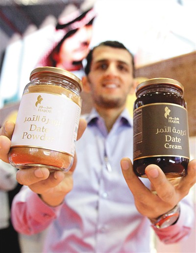11月7日,第二届进博会沙特阿拉伯国家馆工作人员在展示产自沙特的果酱。新华社记者 陈 飞摄