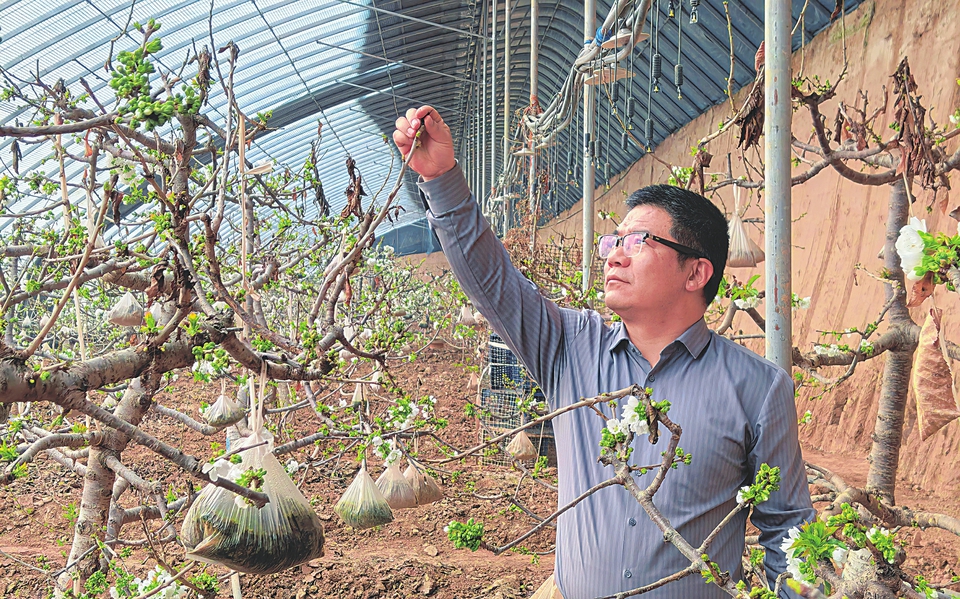 娄渊斌正在检查车厘子树开花情况。本报记者畅雪摄