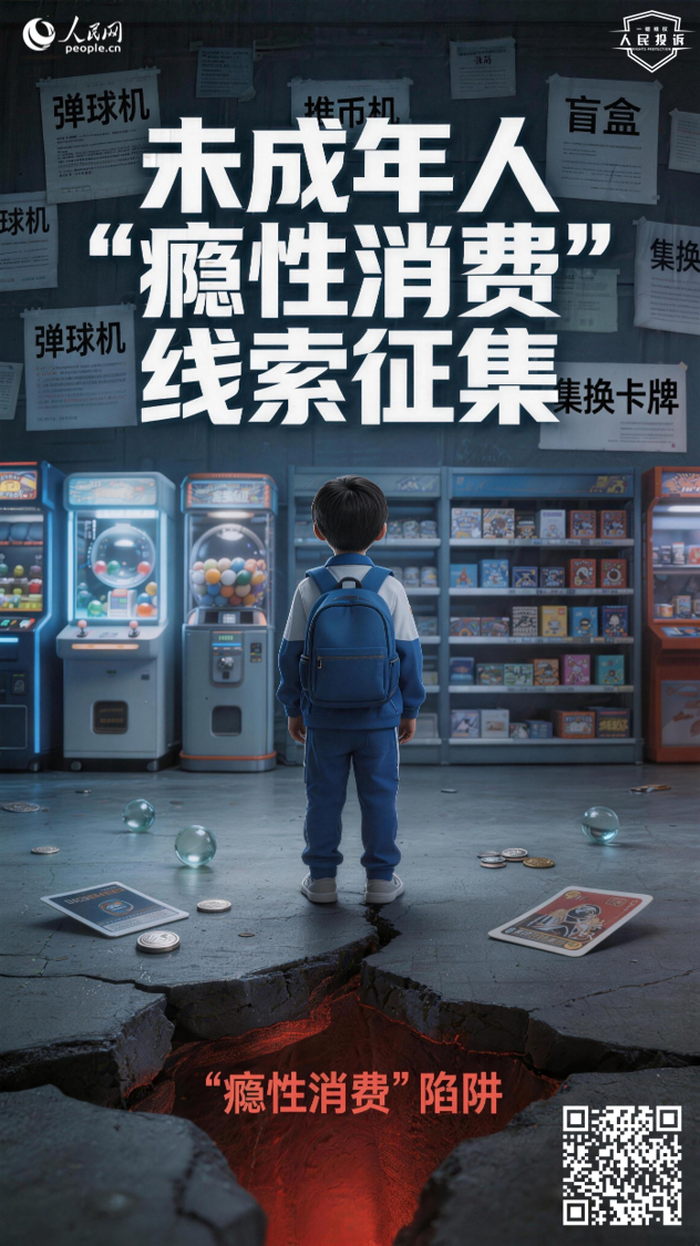 从弹珠机、推币机到集换卡牌、盲盒扭蛋,一些线下消费场所正利用“随机奖励”“差一点就中”等心理机制,让孩子反复投入、难以自拔,却无年龄限制或防沉迷提示。孩子的成长不该被“瘾性陷阱”裹挟,未成年人的合法权益更应得到坚实守护。即日起,人民网“人民投诉”平台征集未成年人“瘾性消费”线索。如果您遇到以下情况,请告诉我们: