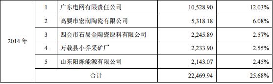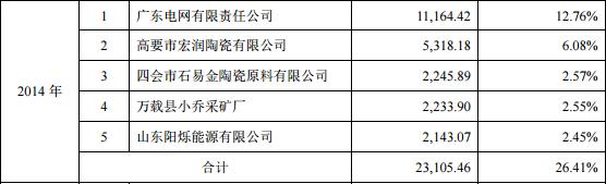 在新版的招股书中,2015年,公司前5大供应商分别是广东电网有限责任公司、高要市宏润陶瓷有限公司、佛山市圣八达贸易有限公司、万载县小乔采矿厂、万载灏翔达采矿厂,采购金额分别为10220.23万元、5427.98 万元、2402.34 万元、 2276.07 万元、2253.53万元,占采购总额的比例分别为12.04%、 6.40%、2.83%、2.68%、2.66%。