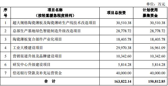 1.超大规格陶瓷薄板及陶瓷薄砖生产线技术改造项目,项目总投资30,510.38万元,计划使用募集资金30,510.38万元;2.总部生产基地绿色智能制造升级改造项目,项目总投资28,778.72万元,计划使用募集资金28,778.72万元;3.陶瓷薄板复合部件产业化项目,项目总投资18,405.78万元,计划使用募集资金18,405.78万元;4.工业大楼建设项目,项目总投资29,970.38万元,计划使用募集资金16,961.09万元;5.营销渠道升级及品牌建设项目,项目总投资10,342.60万元,计划使用募集资金10,342.60万元;6.研发中心升级建设项目,项目总投资5,814.28万元,计划使用募集资金5,814.28万元;7.偿还银行贷款及补充运营资金,项目总投资40,000.00万元,计划使用募集资金40,000.00万元。