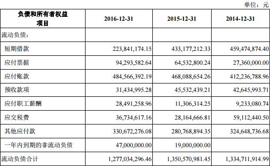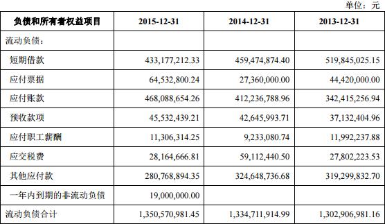 招股书数据显示,蒙娜丽莎2013年至2016年负债总计分别为13.27亿元、14.22亿元、14.15亿元、13.56亿元;流动负债分别为13.03亿元、13.35亿元、13.51亿元、12.77亿元。