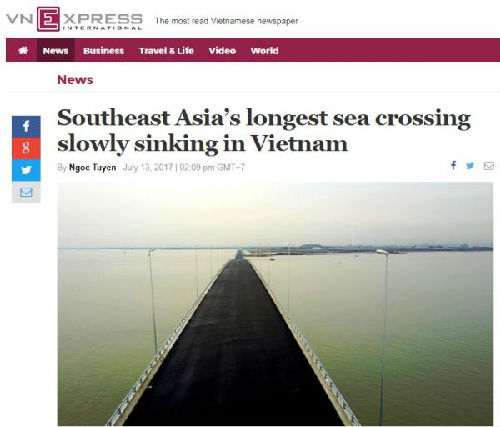 这座桥号称是东南亚最长的跨海大桥,路线全长约15公里,是日本援助了10万亿越盾(约合人民币30亿元)修建的。不过现在,工程尚未完全竣工,但越南媒体报道称,这座桥好像看上去正在“缓缓下沉”。