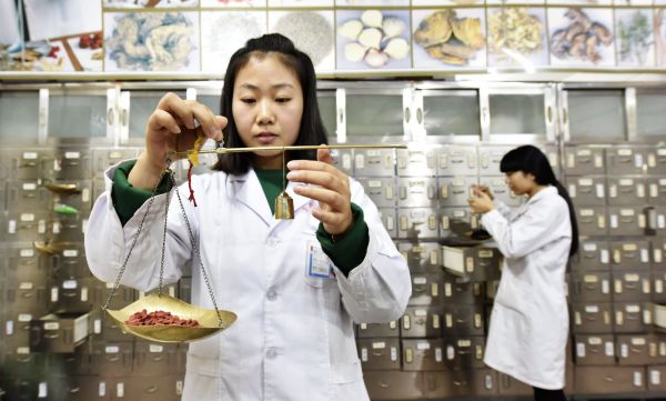 资料图:2016年12月21日,在河北涉县中医院中药房内,工作人员忙着为顾客配制冬季进补类中草药。 新华社记者 王晓 摄