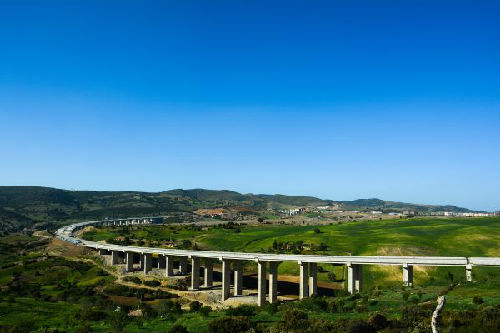 中国建筑股份有限公司阿尔及利亚分公司修建的南北高速公路希法段项目于2012年开工。图为2017年4月18日,在阿尔及利亚麦迪亚省境内的南北高速公路希法段项目建设工地,工程机械进行桥梁铺设。(新华社)