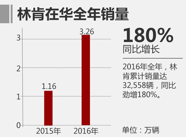 在陆续引入四款新车后,随着产品线的逐渐丰富,开始走“亲民”路线的林肯在重回中国市场后销量大幅攀升。较之2015年的11,630辆,2016年全年林肯累计销量达32,558辆,同比劲增180%,其增速成为中国成长最快的豪华品牌。在第四季度,林肯单月销量达11,562辆,占全年销量的35.5%,同比增幅162%。