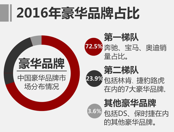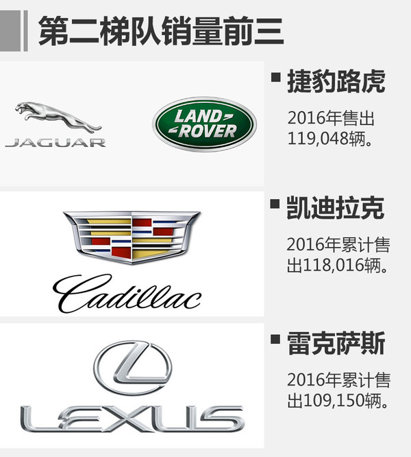 而包括捷豹路虎、凯迪拉克、雷克萨斯、沃尔沃、英菲尼迪、林肯和讴歌组成的豪华品牌第二梯队,2016年总销量为520,354辆,占整个豪华车市场23.9%。注:保时捷品牌定位问题,不算在第二梯队内。