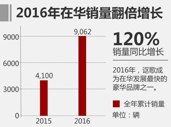 由于此前在华的产品投入等多方问题,入华已经达到10年的本田高端品牌讴歌,销量并没有得到显著提升,2015年讴歌在中国市场的新车上牌量仅为4,100辆,数据并不美丽。2016年讴歌重整旗鼓,制定完善的在华战略,推出首款国产车型CDX后其销量得到明显提升,2016年累计售出9,062辆,同比大增120%,成为增速第二快的豪华品牌。