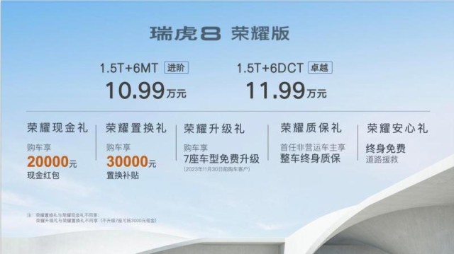 此外,瑞虎8荣耀版还为购车用户带来了5重购车礼遇,包括荣耀现金礼:购车即享20000元现金红包、荣耀置换礼:购车即享30000元置换补贴(本品/他品同享)、荣耀升级礼:购车可享7座车型免费升级(2023年11月30日前购车客户)、荣耀质保礼:首任非营运车主享整车终身质保、荣耀安心礼:终身免费道路救援。(注:荣耀置换礼与荣耀现金礼不同享;荣耀升级礼与荣耀置换礼不同享;不升级7座可抵3000元现金。)