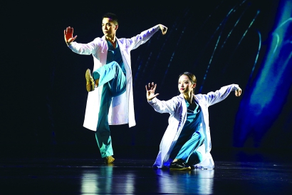 欣赏过《止戈抗疫》的观众有这样的感觉:剧中的武术表演非常精彩,让人耳目一新。比如一身白衣的医护人员与一身黑衣的“新冠病毒”之间的拳法较量,有贴身肉搏,也有不接触身体的打斗,医护人员舍己为人的英勇形象非常饱满。不仅是各路拳法,各种器械表演在剧中均有展现,导演组根据不同职业的特点,为舞台上各色人物设计妥帖的武术语言。“剧情里舞枪弄剑不太合理,所以就把器械融合在职业特点中。比如建筑工人用棍子来传递他背后的力量;快递员的包裹设计成盾牌,表达风雨无阻的概念……”郑思文解释,运用武术独有的肢体语言,以拳法、器械的技术动作为载体,将武术的专业技能与舞台艺术的表现形式融合起来。