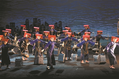 此次,观众在《红头巾》中看到了很多现代艺术手段。比如,3个男子男扮女装去招工的舞蹈,不仅展现了传统戏曲里的丑角特色,也让人想到了近年来让人捧腹的男版“四小天鹅”之舞。而尾声处3个报童用说唱的形式播报1945年至1953年之间的重大新闻事件,也具有浓烈的现代性。这些歌舞化的运用都非常新颖,诙谐的表演,律动的节奏,调和了整个剧的氛围和观众的情绪。