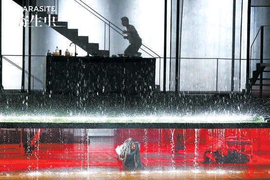 在这方如同社会切面的舞台上,密集的戏剧冲突快速展开。前半部分情绪高涨,金家人的把戏不断得逞,做起了漫无边际的美梦。而随着一场意外的大暴雨,故事急转直下,三家人的矛盾即刻爆发,奔向了格外惨烈的结局。在两个多小时的表演中,演员们相当卖力,饰演金家姐弟的郝蕾与马天宇都交上了合格的答卷。在对姐姐金基婷一角的驾驭上,话剧表演经验丰富的郝蕾显然游刃有余,甚至会让观众感叹她的演技有些大材小用。首次出演话剧的马天宇也值得肯定。饰演金家父母的房子斌和赵红薇堪称全剧的灵魂,大段的台词、极致的情感落差对他们的体力和表演功底都提出了相当高的要求。谢幕时,观众格外热烈的掌声是给予演员的最好肯定。舞台上,金父应聘朴社长司机、所有人为朴家小儿子演出庆生小戏剧等片段运用了相当风格化的表演方式,在滑稽而悲凉的黑色幽默中,充分展现了舞台艺术区别于电影的独特虚拟性和表现力。