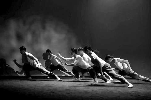 作为舞蹈剧场,《凝》的呈现非常先锋,给人最大的震撼是它没有明确的剧情发展线。大幕开启后,十几位舞者在舞台上站立,用一串不断重复、节奏逐渐变化的马步开启演出,在前十分钟左右的时间里,表演几乎没有背景音乐,间或两声鼓声,抑或是梆子声,让舞者变化了节奏。忽然,舞者向前出拳,展现出快、准、狠的劲道与爆发力,呼吸声与拳风都在耳边。就这样,《凝》进入了武术与舞蹈交融的世界,或呈现爆发力,或展现生动多姿的招式,或大开大合地舒展动作,将蔡李佛拳、白鹤拳、洪拳三大派别的武术招式意象化地展现。
