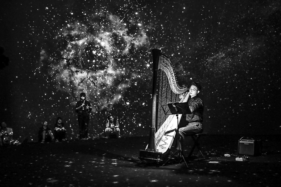 开幕当天还举办了以“奔赴天文与艺术的宇宙浪漫”为题的论坛,围绕展览中的天文艺术作品展开讨论。时代美术馆执行副馆长刘威威表示,展览通过艺术化手段、人文关怀的角度呈现硬核科学知识,让公众更好地认知科学,感受宇宙的浪漫。她相信,这样“诗意的科普”与“科普的诗意”结合也许是未来科学艺术展的趋势之一。论坛结束后,青年竖琴演奏家马佳杰在星辉斑斓的展厅内带来了精彩的现场音乐会。展览将持续至10月8日。