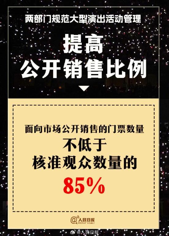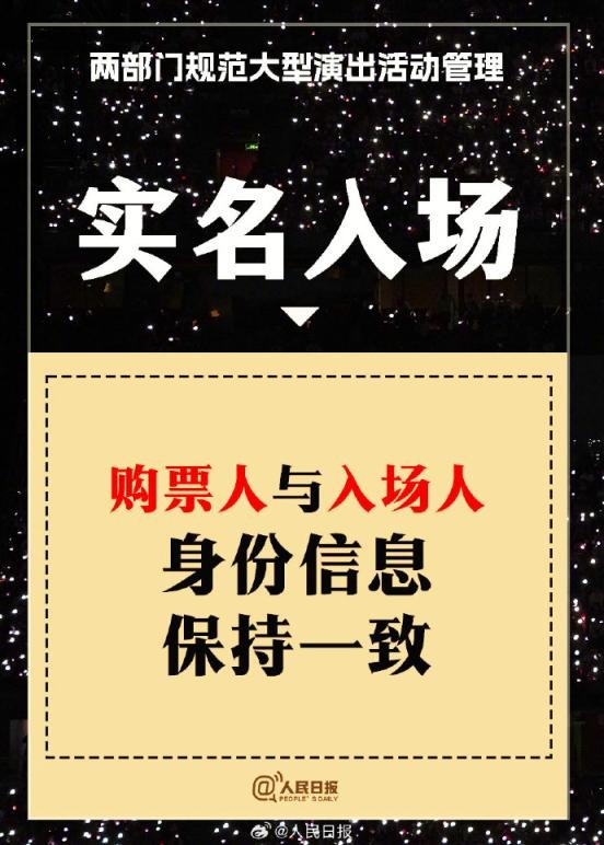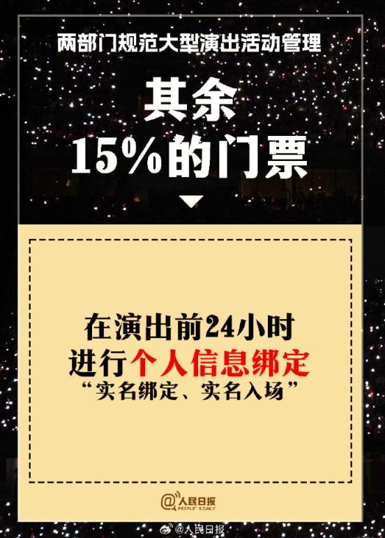 两部门通知:①实名购票、实名入场。5000人以上演唱会购票人和入场人必须一致;②大型演出要设定梯次退票标准;③公开销售门票不低于核准观众数量的85%;④严禁假唱、假演奏。更多↓↓↓详戳,周知!