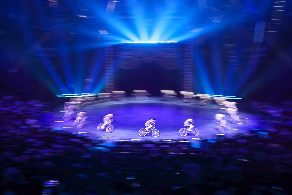 中国杂技团演员表演创新节目“逐风者·男子集体车技”,综合运用翻腾、顶功、抛接等技艺(11月5日摄)。新华社记者 刘大伟 摄