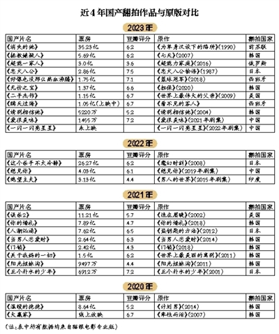 新京报整理了近4年,国产电影的翻拍情况,2023年有11部翻拍片上映,创下近5年数量之最。今年暑期档上映的电影《消失的她》以35.23亿票房,成为内地影史翻拍片最高票房纪录保持者。
