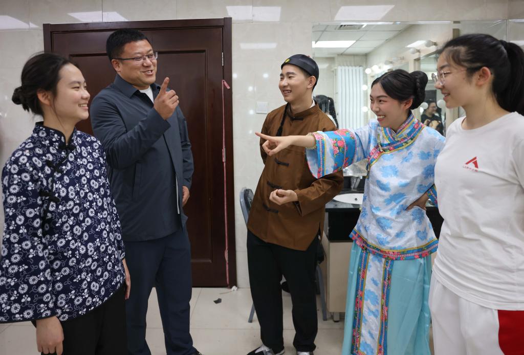 5月11日,中国人民大学附属中学分校副校长王尧(左二)与学生交流戏剧舞台动作。新华社记者 殷刚 摄