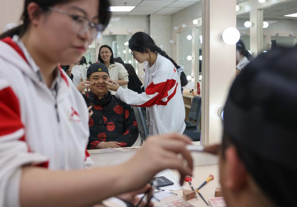 5月11日,中国人民大学附属中学分校的学生在演出前化妆。新华社记者 殷刚 摄