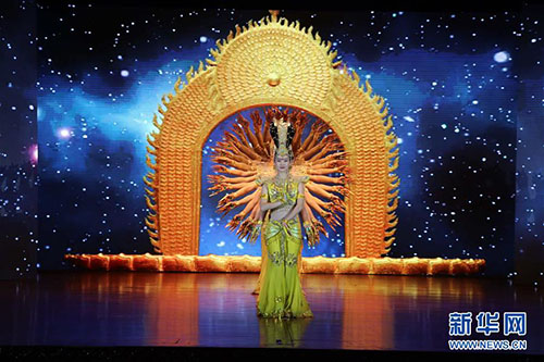 1月30日,在柬埔寨金边,来自中国残疾人艺术团的演员在表演《千手观音》。