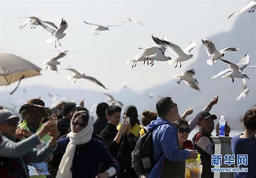 2月10日,游客在昆明滇池畔观赏红嘴鸥。新华社发(梁志强 摄)
