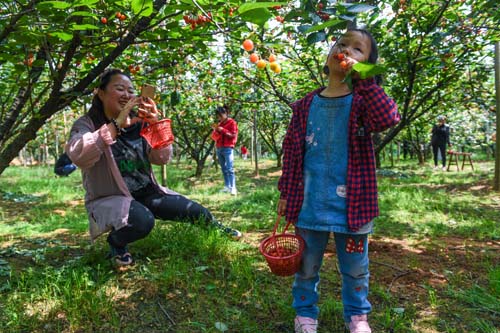 4月27日,游客在泗安镇毛家村的樱桃园内采摘樱桃。毛家村种植了2000多亩樱桃,预计今年每个樱桃种植户人均可增收9000元左右。