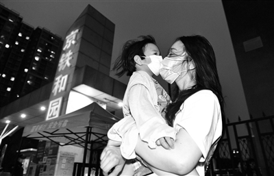 昨晚8点刚过,京铁和园小区已有居民走出小区,前往附近的超市、公园。在小区门口,3岁的多多老远就看到门外的妈妈,高兴坏了。多多的妈妈告诉北青报记者,孩子一直住在京铁和园的奶奶家,社区封闭后,她只能晚上隔着大门看看孩子。听说昨晚社区解除封闭,她特意赶过来想抱一抱多多。不过,由于多多和奶奶的出入证正在办理中,孩子还不能走出小区。在征得门口值守人员的同意后,多多跟妈妈终于在小区外重逢,母子俩拥抱在一起。