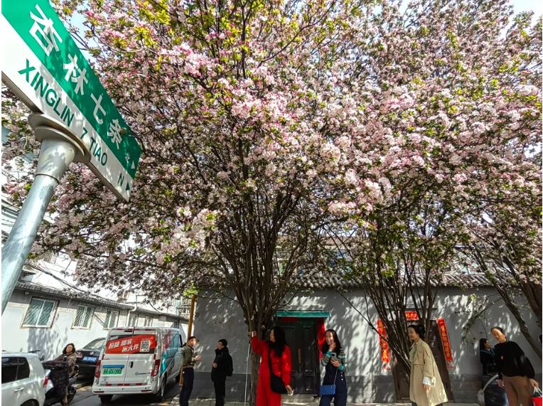 “一朵海棠露春芳,一树海棠春满堂。”“这个路牌也太春天了吧,趁着春光明媚,带上相机来打卡吧。”“这几天,这里成了最浪漫的打卡地,喜欢拍照的,赶快去吧!”杏林七条海棠花绽放,从去年海棠盛开时就火爆出圈,几十米长的小巷总能看到游人如织的场景,这处隐匿在闹市中的花海如此热闹,许多市民都是看到短视频后慕名而来,希望与这片美丽花海来一次亲密接触。