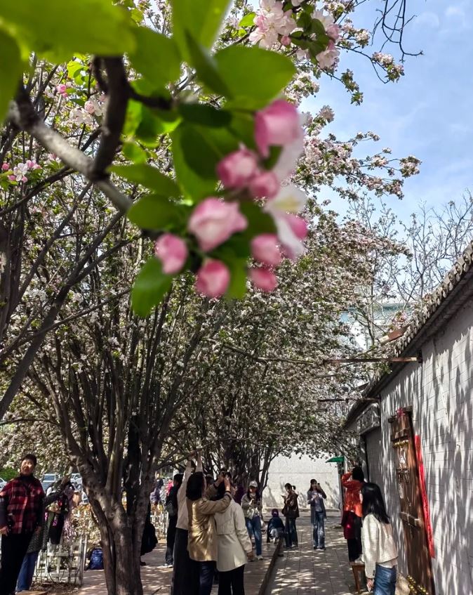 山西日报新媒体记者吴晓庆报道 清明时节,一场绵绵春雨过后,太原杏林七条盛放的海棠让人们邂逅了一场美不胜收的花海。粉白相间的海棠、富有年代感的木门与灰色的砖墙,优雅中带着古典,古典中又透着浪漫的气息,清明小长假,许多市民身着艳丽的服装,前来这条位于桃园三巷附近的“网红”小巷打卡留念。