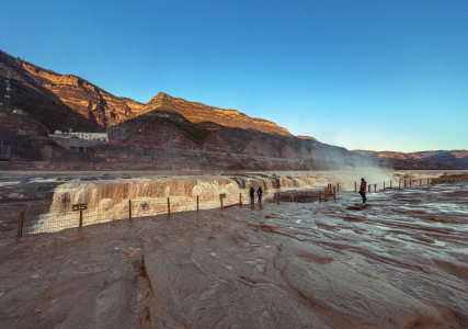 从黄河壶口瀑布入口处出发,沿着指示牌步行约一刻钟,即可到达主瀑观赏区,站在观瀑台上,可俯瞰壶口瀑布全貌,感受黄河水从壶口如同万马奔腾冲入壶底的壮阔美景。沿着步道前行,可以看到黄河水流经的地方,河床狭窄,水流湍急,站在这里便可以近距离感受壶口瀑布的视听震撼。黄河水飞流形成的水雾漂浮于空中,就像江南的烟雨蒙蒙,湿人衣衫,浸润人心。越接近河面,水雾越是浓密,形成了水底“冒烟”的奇妙景象,在岸边观赏时不妨体验一下这独特的“晴空洒雨”。