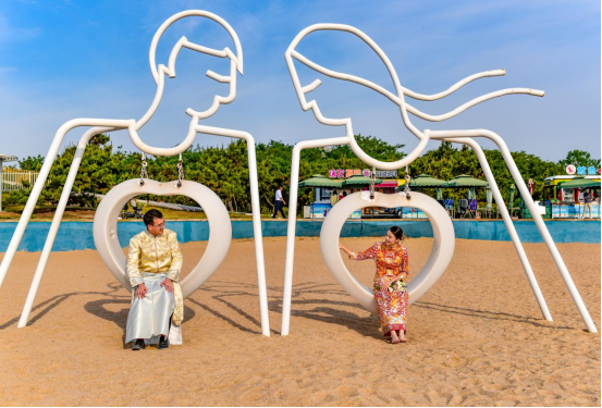 沙滩上的网红打卡点成为拍摄婚纱照的热门地。新华网发(叶连俊 摄)