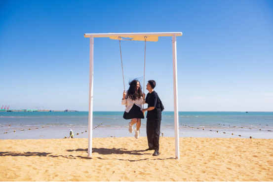 游客在沙滩秋千上享受海风吹拂的浪漫。新华网发(陈光金 摄)