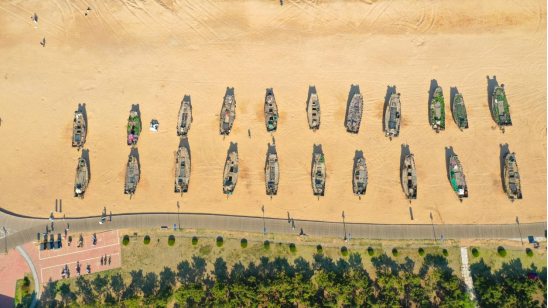 渔船整齐排放在沙滩上。新华网发(卜凡文 摄)