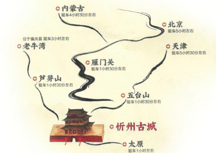 来到这里,你可以站在沟壑纵横、梁峁起伏的黄土高原,欣赏悬崖峭立、水石相激的晋陕峡谷,也可以在古木参天、浓荫蔽日的森林公园里散步,在百草茂盛、一望无垠的高山草甸上仰望星空。你可以游览世界文化景观遗产、佛教名山的五台山,也可以领略秀容、岢岚、宁化、代州4座悠远古城的各有千秋,登攀三关营堡、历朝历代的边塞长城。你可以在偏关老牛湾古渡、河曲西口古渡摇橹渡河,回想晋商的辉煌,也可以身临夜袭阳明堡飞机场遗址,重温荣耀,感受历史的震撼……