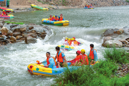 体验完水上乐园后,张子良一行乘车来到位于中庄村的庞泉沟激情漂流。刚下车就看到了码头上热闹的景象,一艘艘漂流艇上坐满了前来体验的游客,大家穿着救生衣在工作人员的护送下向下漂流。偶尔遇到一处急流险滩,漂流艇随着奔腾的水流飞驰而起,一眨眼的工夫就已落到了下一个平潭区,游客们发出了阵阵尖叫。一路刺激,一路惊心,漂流给游客们留下了深刻的印象。负责该项目的闵玉贵介绍,项目选取了文峪河最精华的10公里河道,累计落差130米,平均水深0.8米,河道时宽时窄,水流时急时缓,沿途既有急流险滩,又有缓流碧潭,由于经过了精心设计,且河道两岸安排了上百名安全员护航,可以确保有惊无险。