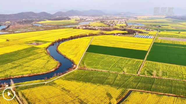 眼下,安徽省池州市东至县张溪镇油菜花进入盛花期。从空中俯瞰,金色花海如大地铺就的锦绣绒毯,与青山、村落、溪流相映成趣,勾勒出一幅诗意盎然的春日田园画卷。